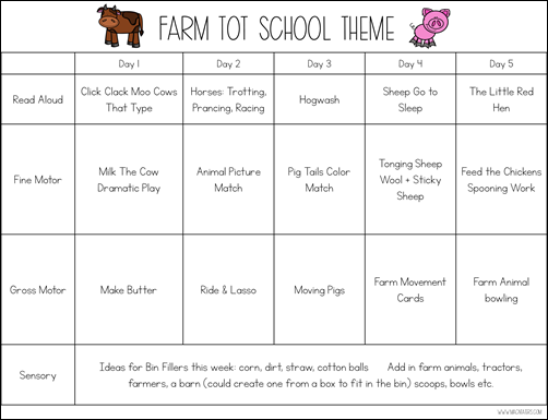 Also included is a 5 day Tot School plan which includes a read aloud (typically the same as the preschool read aloud), a fine motor and gross motor activity for each day of the week and one weekly sensory bin idea.